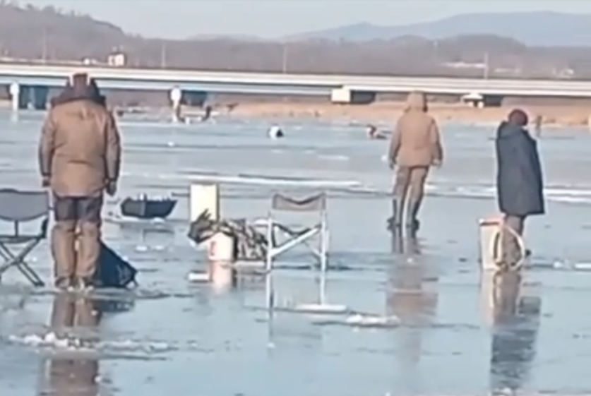 "Майхэ. Достают человека. Все рухнулись. Там лед ломается, веревку кинули", - рассказывает очевидец.
