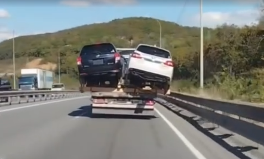 Такой необычный способ перевозки автомобилей попал на видео. На кадрах видно, что на прицепе установлены легковые автомобили, сцепленные в два ряда.
