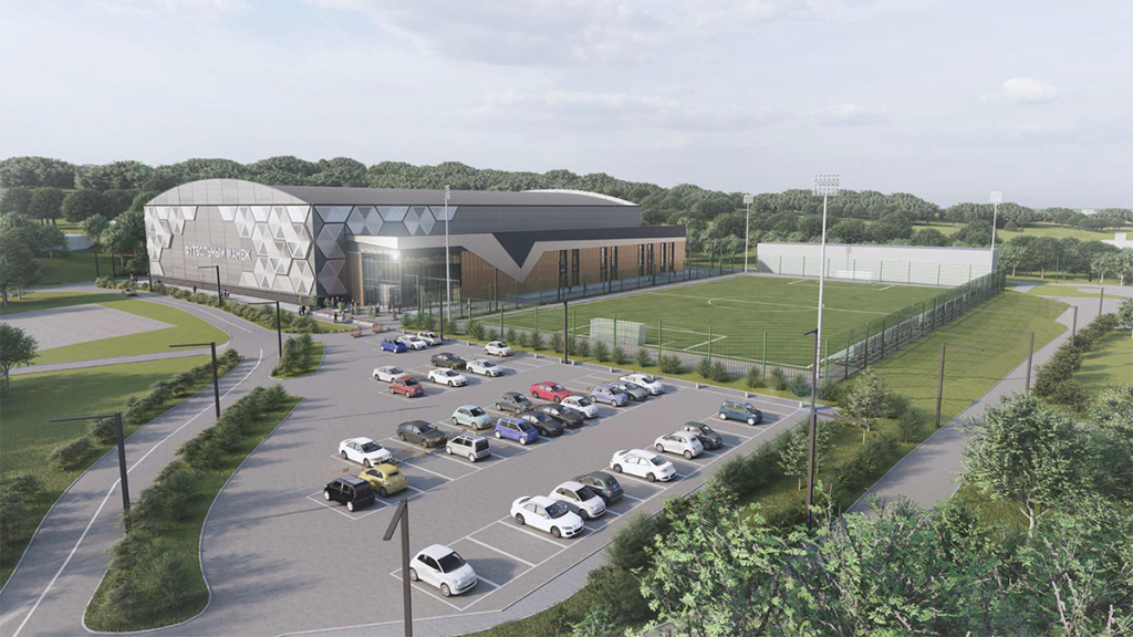 Двухуровневое здание общей площадью почти 10 тысяч квадратных метров включит в себя футбольный манеж – одноэтажный крытый стадион высотой 22 метра над центральной частью и полем 60х90 метров с искусственным покрытием. Административная зона будет находиться во второй двухэтажной части здания. В ней будут расположены четыре раздевалки на 25 человек, тренерские и судейские, медицинский кабинет, буфет, гардероб. На втором этаже будут оборудованы зрительские трибуны на 310 мест, в том числе для маломобильных граждан, административные и учебные помещения.