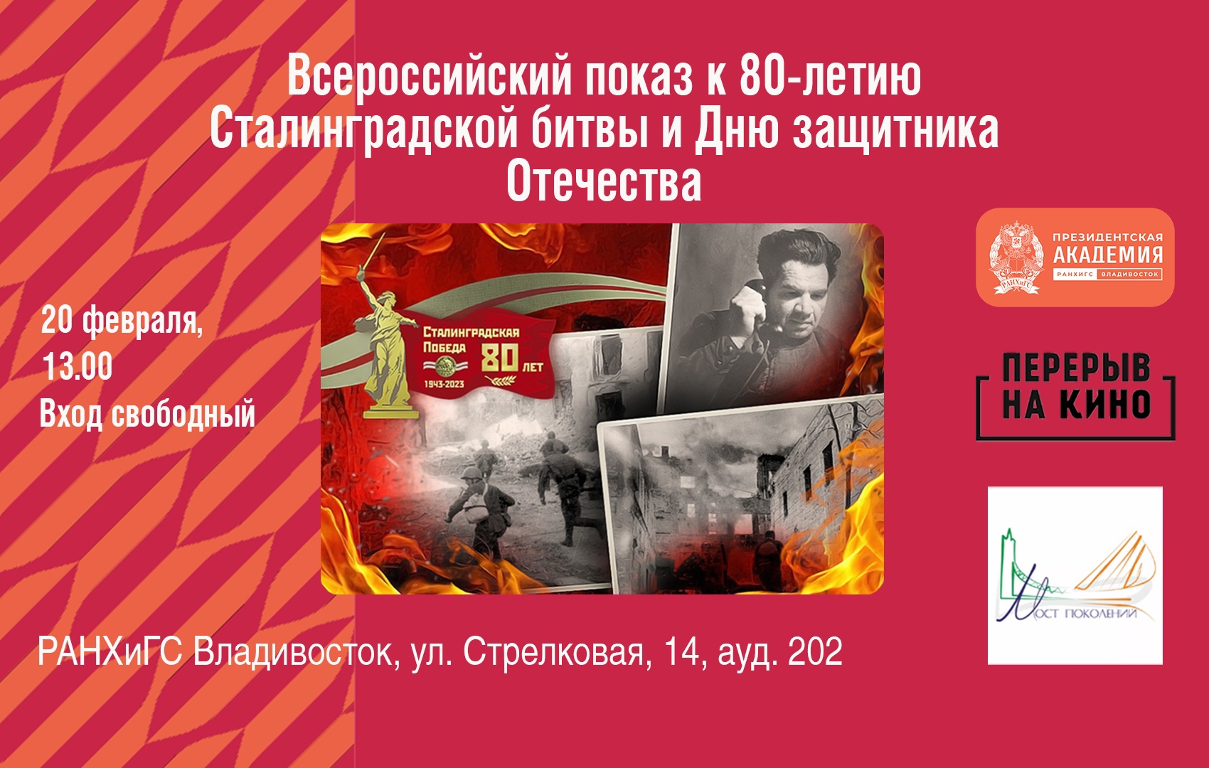 20 февраля в 13.30 в Приморском филиале РАНХиГС (ауд. 202) пройдет всероссийский кинопоказ о подвиге советских воинов в годы Великой Отечественной войны.