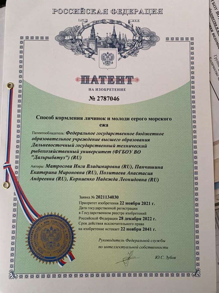 В начале 2023 года Дальрыбвтуз получил ещё один патент на изобретение, которое было зарегистрировано 28 декабря 2022 года. В государственный реестр изобретений РФ вошёл способ кормления личинок и молоди серого морского ежа. Как известно, это ценный гидробионт, икра которого идёт на экспорт, а искусственное выращивание с начала нулевых входит в корпус научных экспериментов ВНИРО. Учёные работают над повышением продуктивности промышленного разведения морских ежей – и Дальрыбвтуз также проводит подобные исследования.