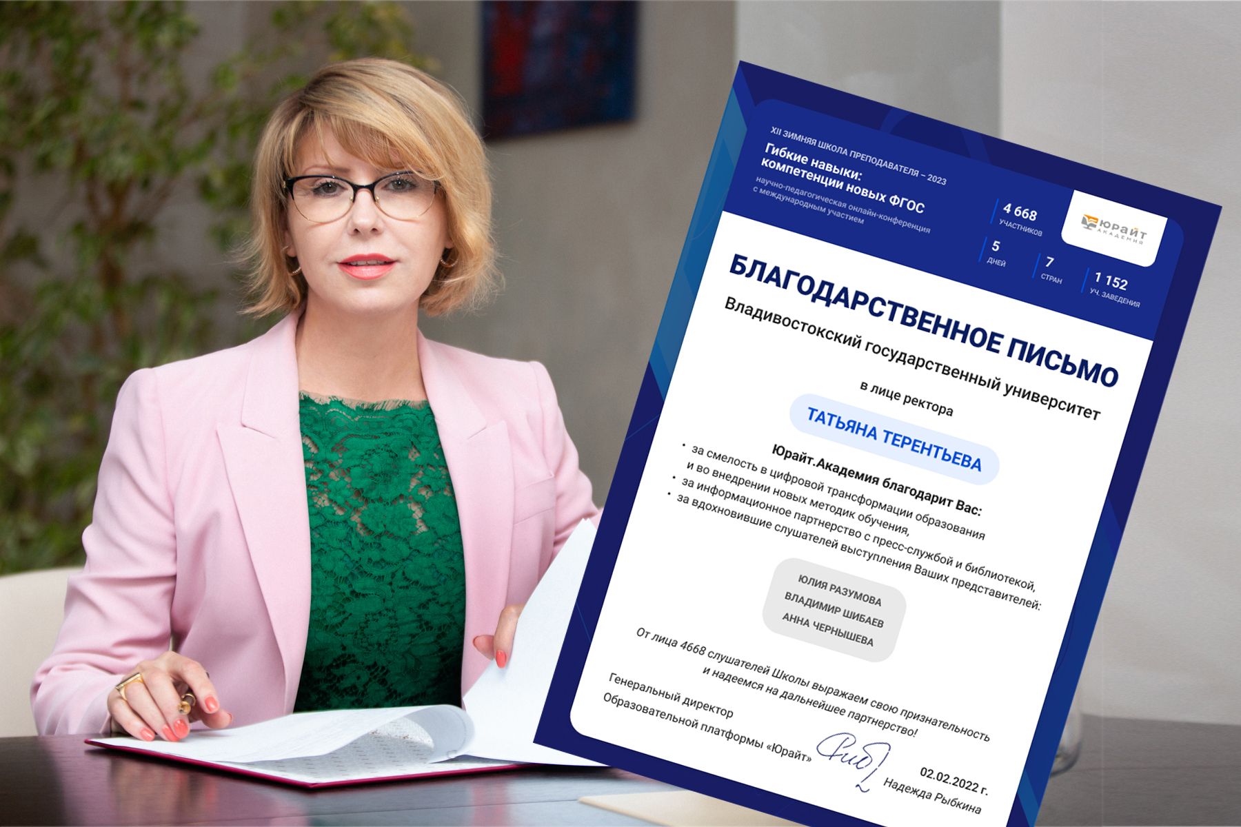 Ректор ВВГУ Татьяна Терентьева получила благодарность образовательного проекта «Юрайт»