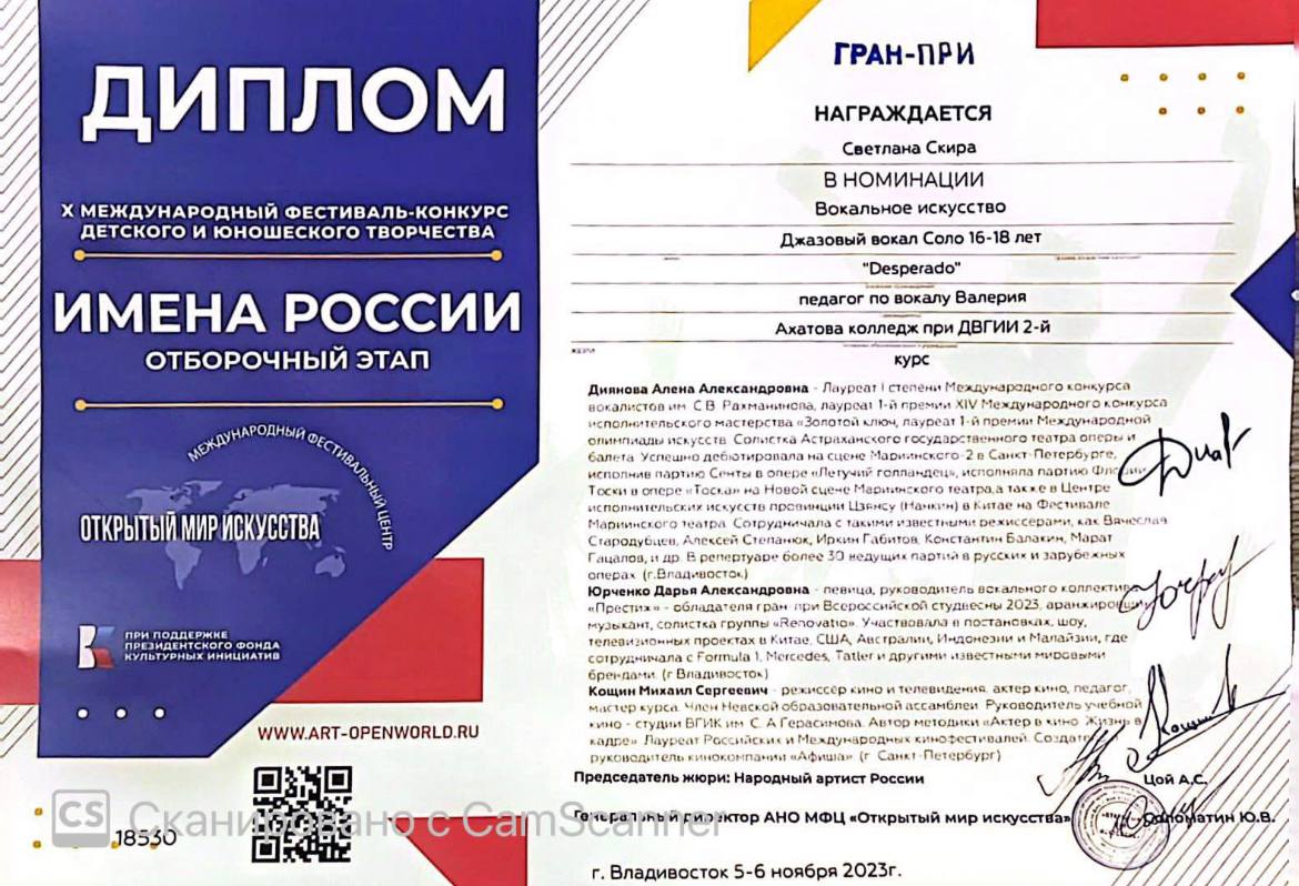 Студентка 2 курса колледжа при ДВГИИ Светлана Скира (педагог по вокалу Валерия Ахатова) получила Гран-При в номинации «Вокальное искусство» на X Международном фестивале-конкурсе детского и юношеского творчества «Имена России».