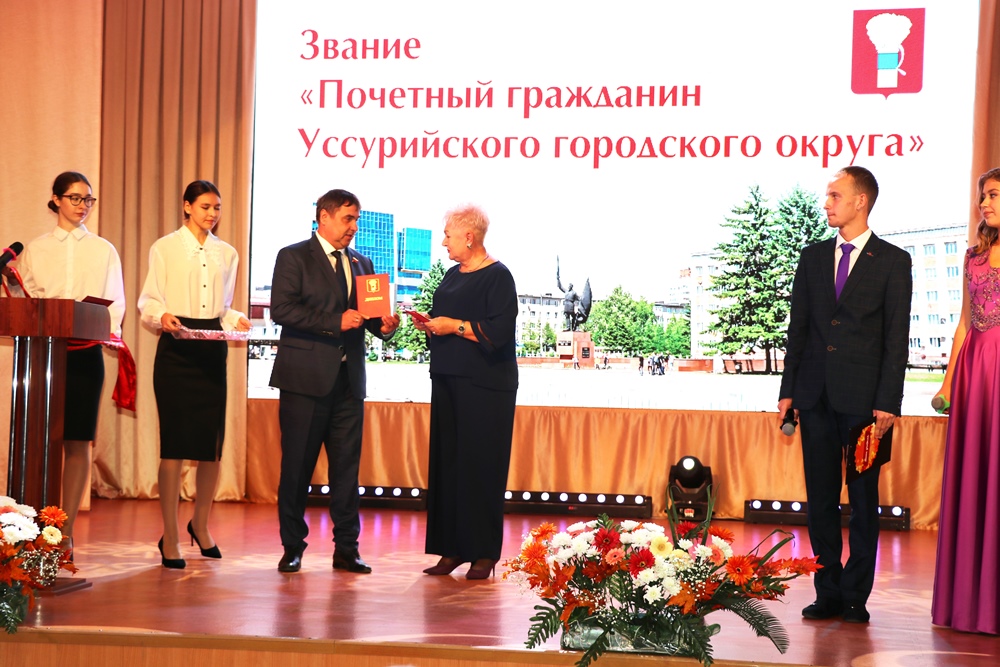 Председатель Думы Уссурийского городского округа Александр Черныш в рамках мероприятия вручил ленту и нагрудный знак «Почетный гражданин Уссурийского городского округа» Заслуженному учителю Российской Федерации Галине Овсянниковой, которая посвятила системе образования более 30 лет. Почетного звания за свои достижения она была удостоена этим летом.