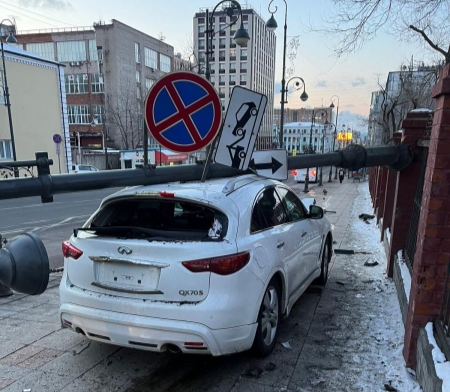Ранее при движении со стороны остановки общественного транспорта «Покровский парк» в направлении остановки «Краевая больница» в городе Владивостоке 32-летний мужчина не справился с управлением автомобиля Infinity и въехал в столб уличного освещения.
