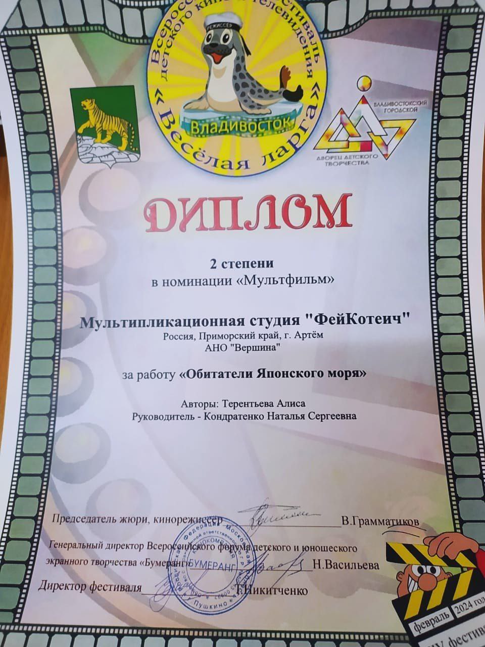 Детские мультики артемовской студии «ФейКотеич» отмечены дипломами на фестивале «Веселая ларга -2024»