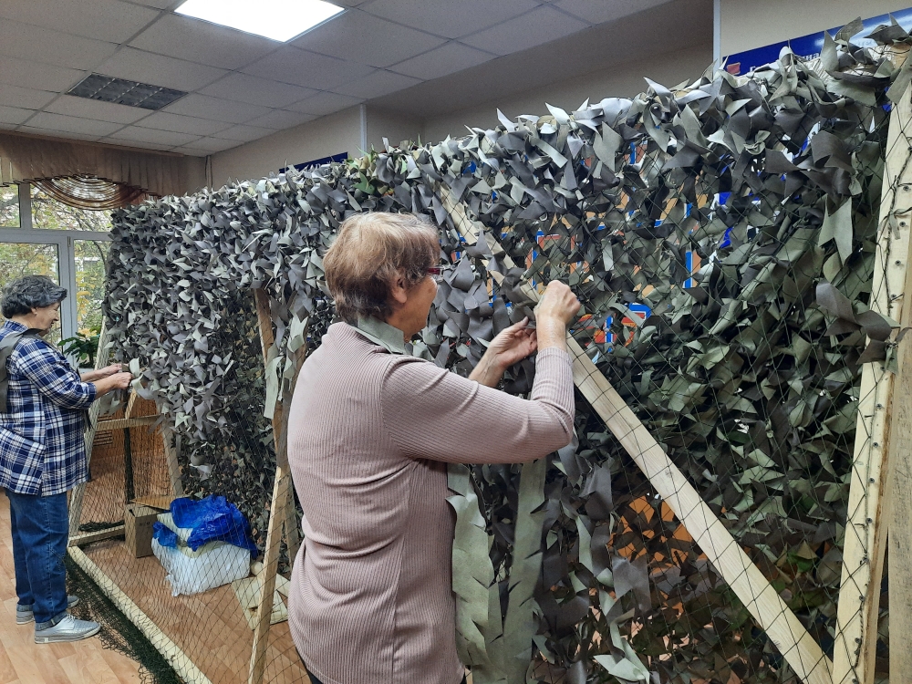 Волонтеры разных возрастов плетут сети, изготавливают окопные свечи, спички охотника, вяжут носки, пишут письма участникам СВО.