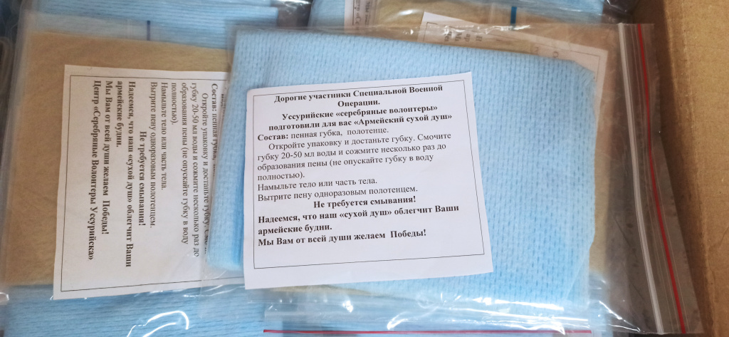Более 250 комплектов салфеток армейского «сухого душа» подготовили «серебряные волонтеры» Уссурийска для передачи в зону СВО.