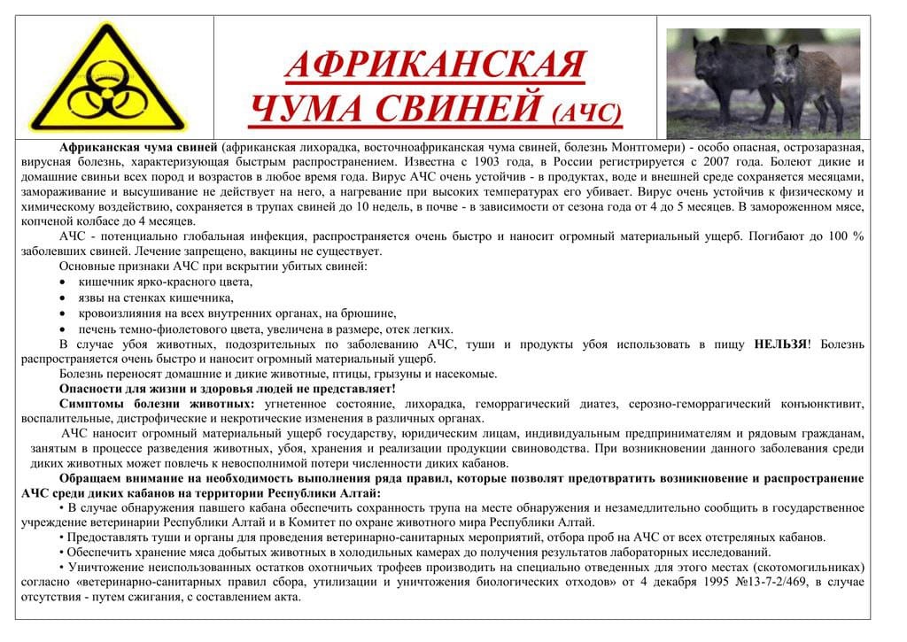 Напомним, чтобы не занести «африканку» в личные хозяйства, необходимо соблюдать следующие правила: давать свиньям проваренный корм, ухаживать за ними в специальной одежде, не использовать лесную подстилку, регулярно травить грызунов. Для человека АЧС опасности не представляет.