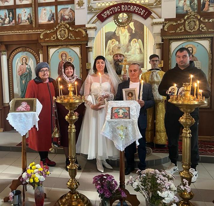 Затем владыка Гурий совершил Таинство венчания местного благодетеля храма Баринова Александра Евгеньевича и его супруги. По совершении Таинства владыка поздравил супругов и пожелал им помощи Божией в созидании малой Церкви – семьи.