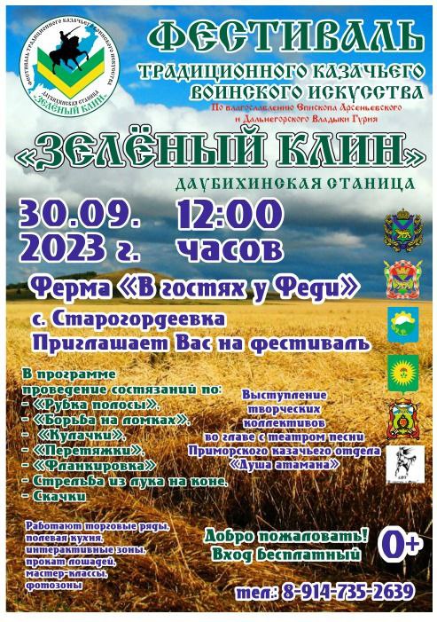 30 сентября 2023 года по благословению владыки Гурия, епископа Арсеньевского и Дальнегорского Гурия, пройдет второй фестиваль традиционного казачьего воинского искусства «Зелёный клин».