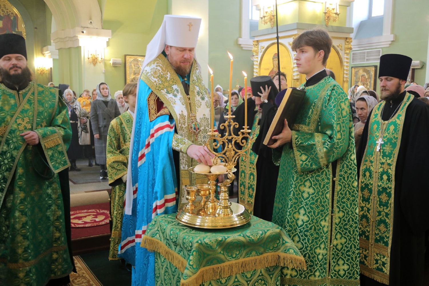Его Высокопреосвященству сослужили: ключарь собора иерей Владимир Плотников, игумен Антоний (Каменчук), протоиерей Игорь Шевчук, иерей Максим Точуков, иерей Виктор Архипов, иерей Дионисий Ищенко.