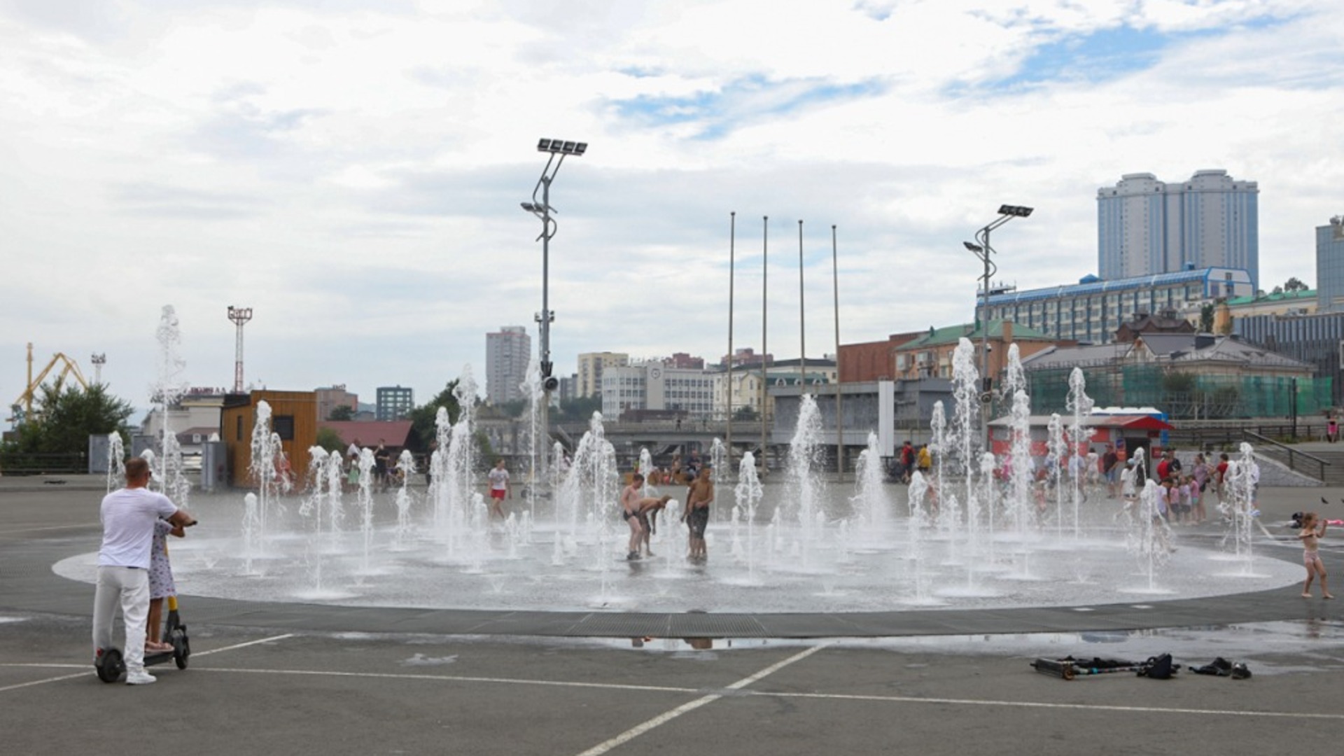 В последние дни в Приморье стоит изнуряющая жара, и фонтан в центре Владивостока так и манит охладиться в водяных потоках.